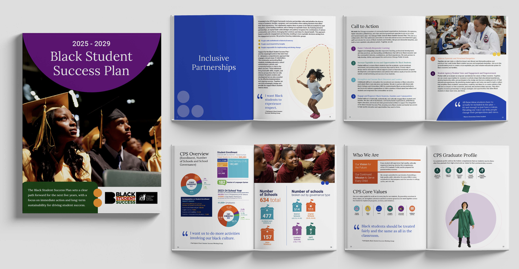 For the Chicago Public Schools Black Student Success Plan (2025–2029), I designed a comprehensive publication that communicates a bold, equity-centered vision for improving outcomes for Black students across the district. The project required translating a complex, multi-year strategic framework into a clear, engaging, and accessible visual narrative. Through intentional layout, strong typographic hierarchy, data visualization, and authentic photography, the final document balances policy rigor with human-centered storytelling, reinforcing CPS’s commitment to accountability, student voice, and long-term systemic change.
